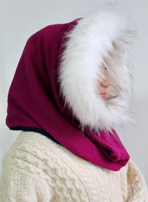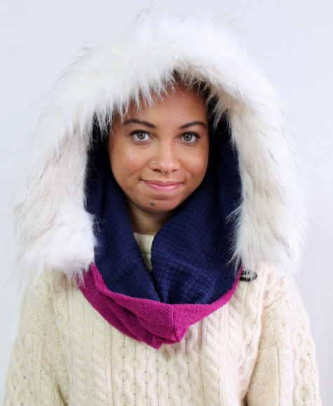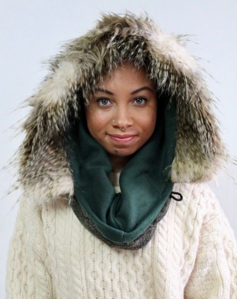 The best-selling Bella Hooded Scarf is a circular scarf with a built in hood, faux fur collar, and button and latch closure. Wear with button open, or closed, as a hood, or as a scarf.