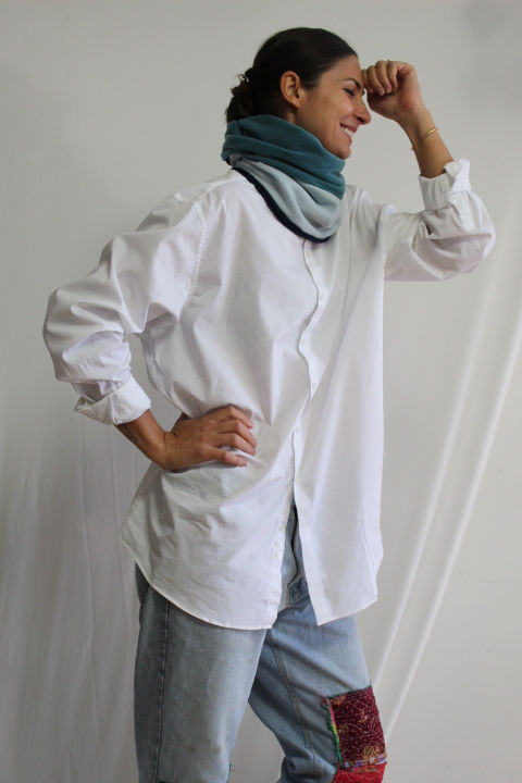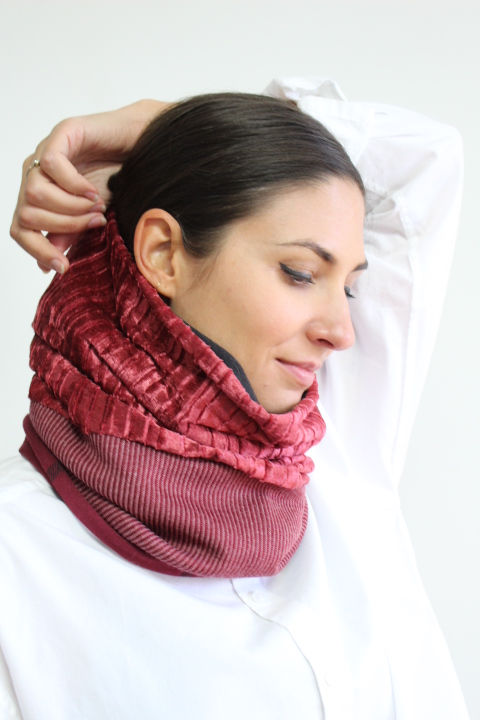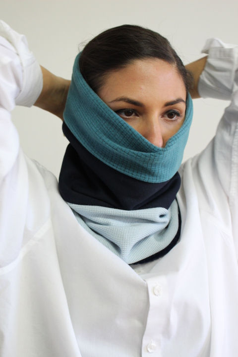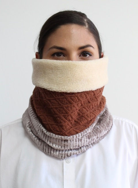 The Carlos is a reversible tube scarf, made with a mix of the remnants of other MAS designs, including fleeces, knits, jerseys, velour, and wool. Because they are made with remnant pieces, each one is one of a kind. Designed to cover your ears, nose, chin, and neck, the Carlos can be folded down as a scarf around your neck, or used as a winter mask.